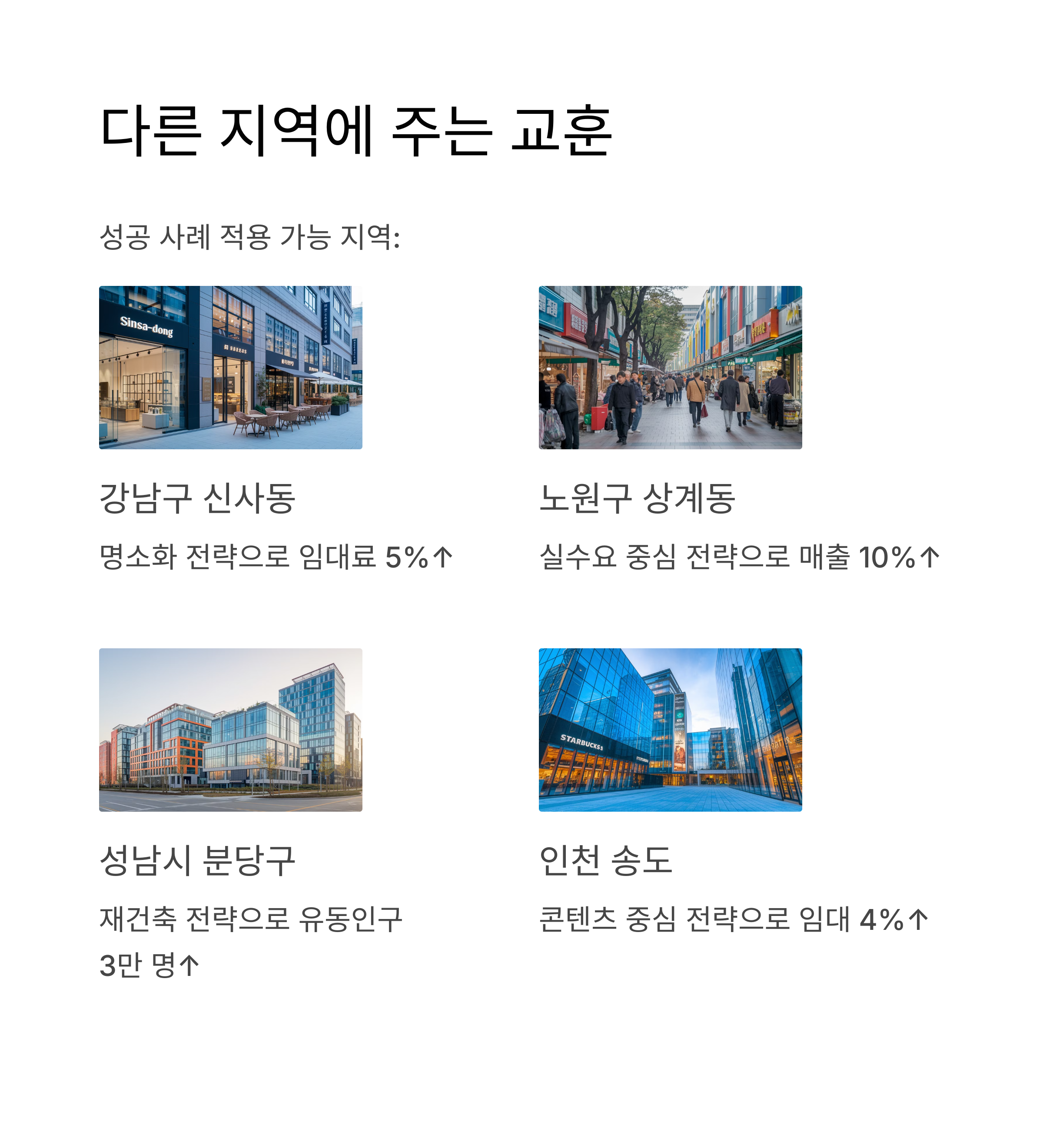 - 강남구 신사동: 명소화(가로수길 연계), 상가 임대료 5%↑ 가능.