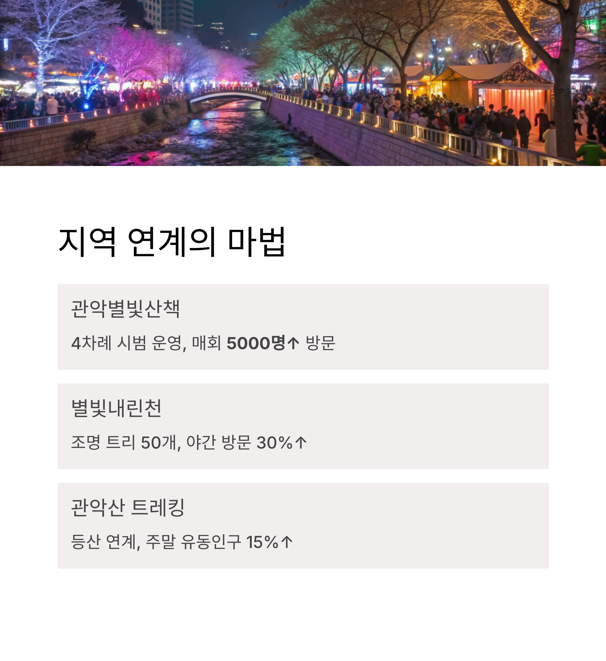 | 별빛내린천 | 조명 트리 50개 설치 | 야간 방문객 30%↑ |