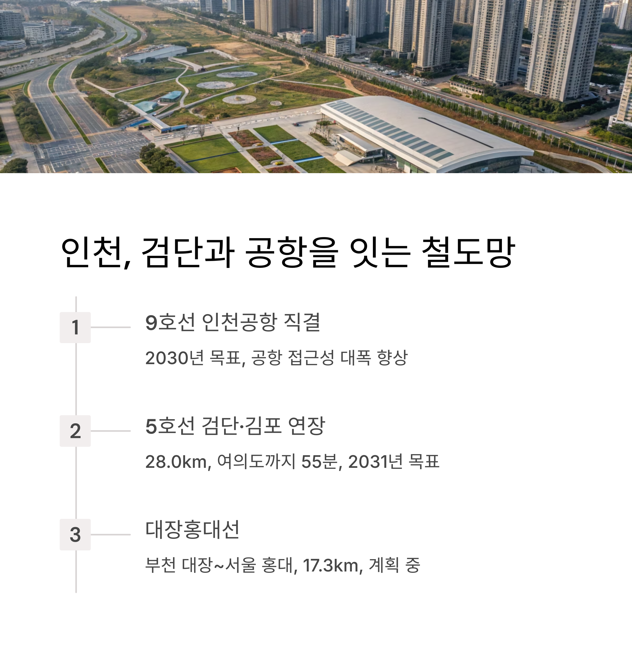 | 5호선 검단·김포 연장 | 방화역~검단·김포, 여의도 55분 | 28.0 | 계획 중 (2031년 목표) |