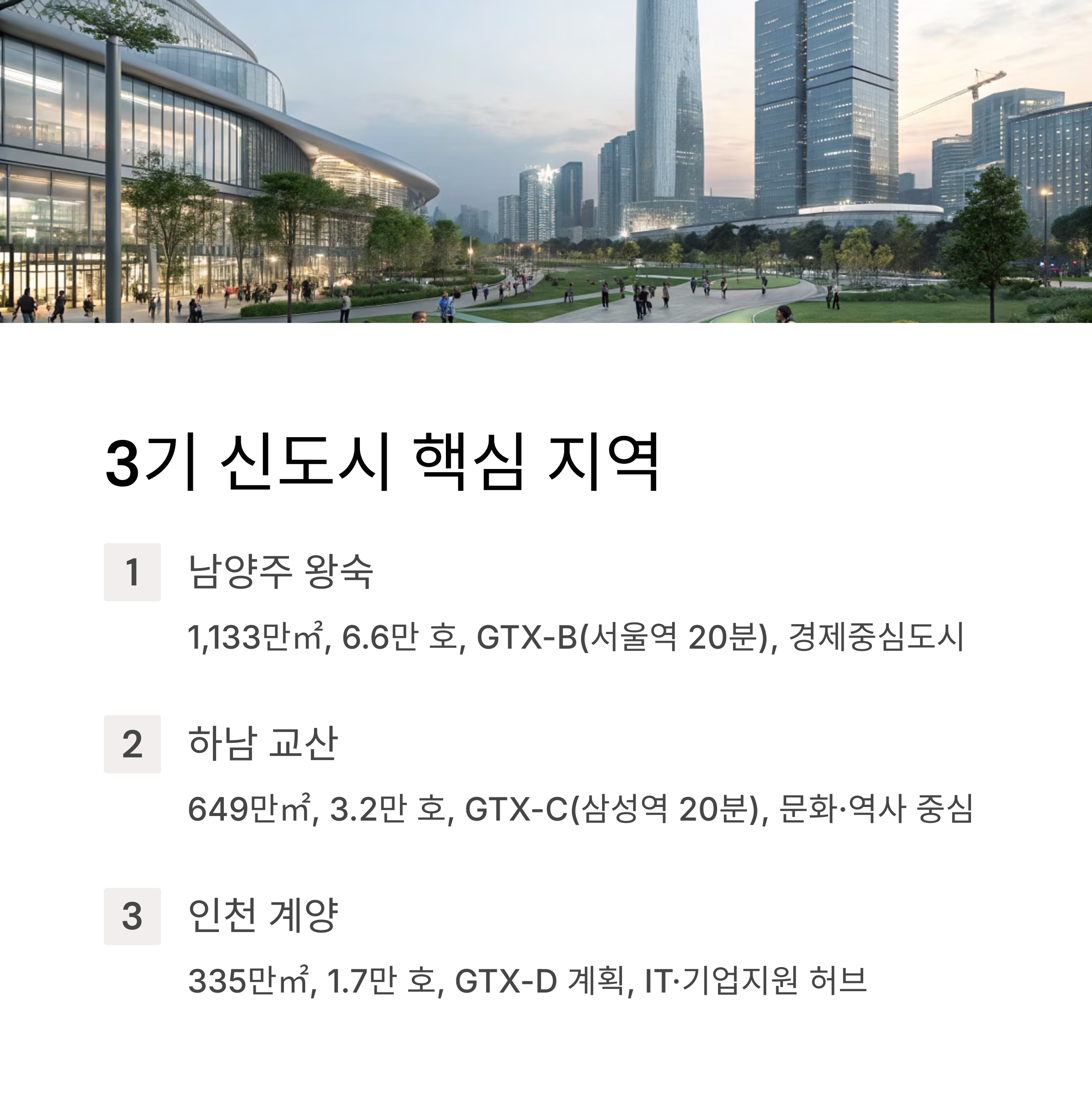 | 하남 교산 | 649 | 3.2 | GTX-C, 삼성역 20분 | 문화·역사 중심 | 토지보상 진행 중 |