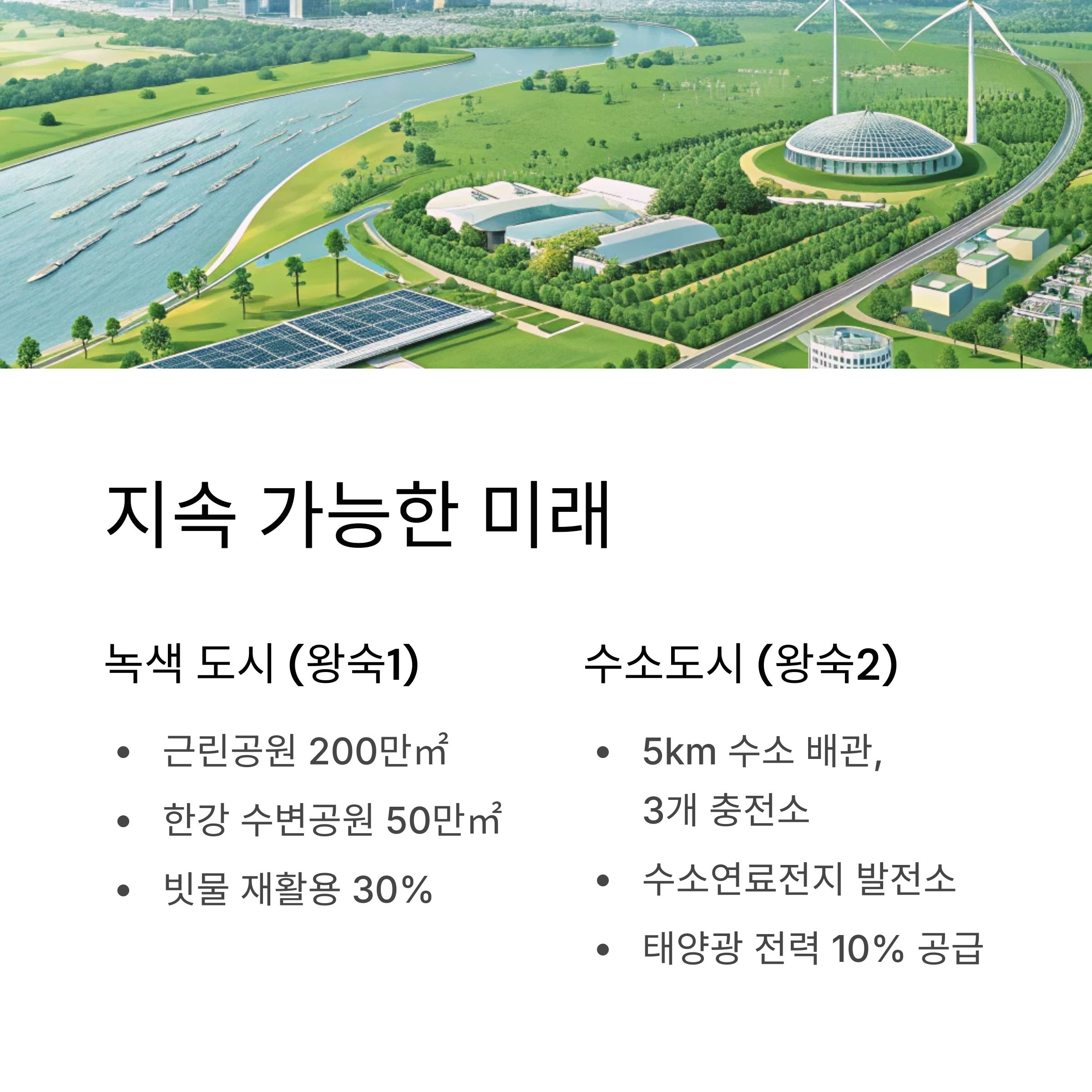 | 탄소중립 | 태양광 10%, EV 충전소 1,000대, 자전거 도로 50km | 2026년 시범 |
