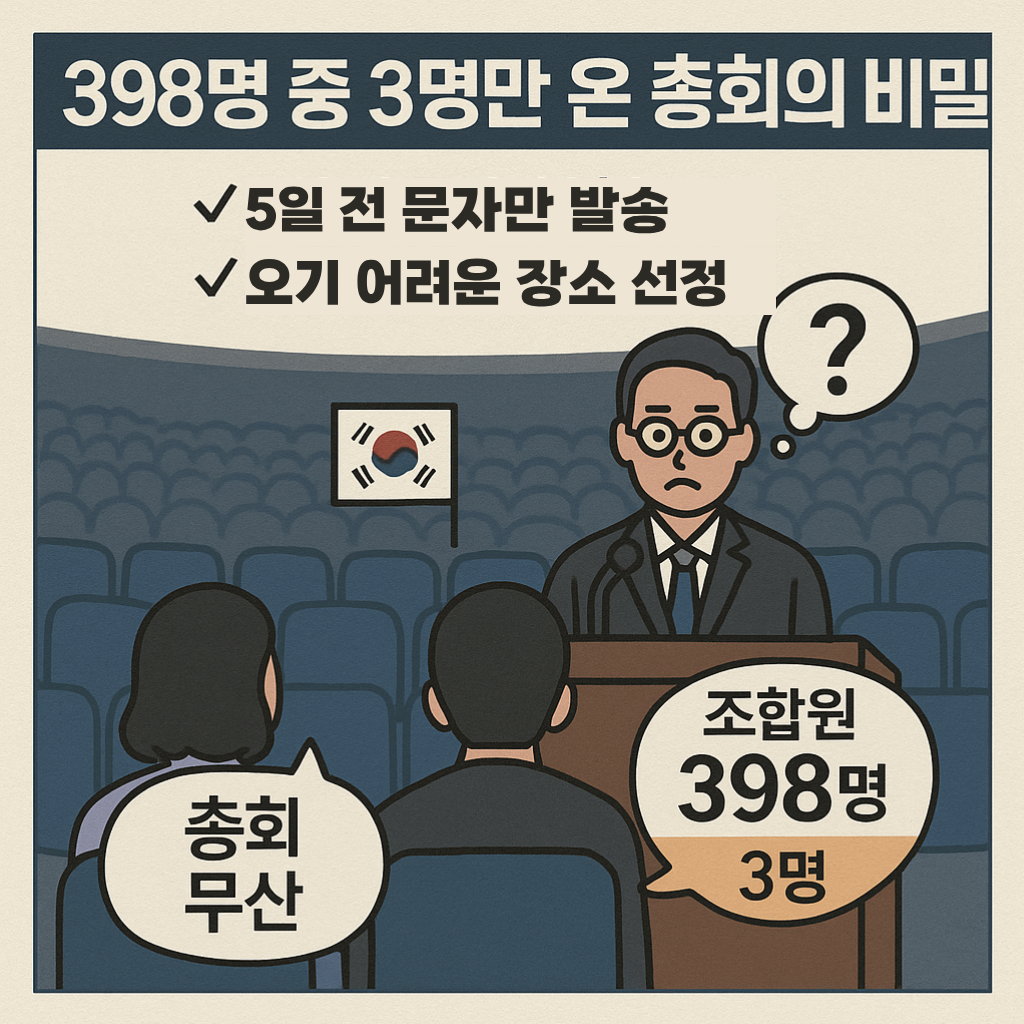 총 조합원이 398명인데, 정기총회에 딱 3명만 왔어요.