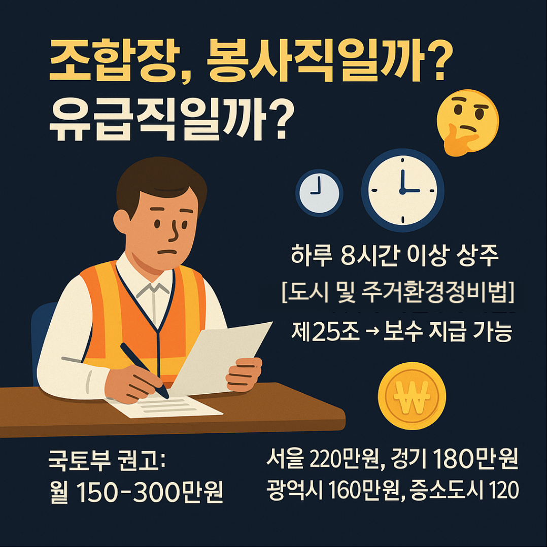 전업 조합장은 월 150~300만원 수준을 권고하고 있습니다.