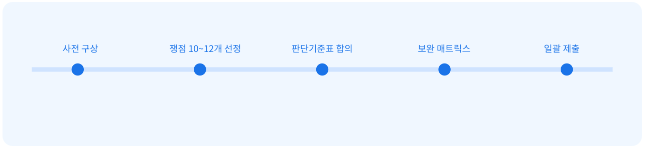 1주차에 쟁점 10~12개만 추려 책임부서와 기준을 확정하세요. 같은 주에 ‘요구-조치-결과’ 표를 만들어 보완 상충을 원천 차단합니다. 이후 모든 요청은 이 표에 매핑해 관리하면 재심의가 줄어듭니다.