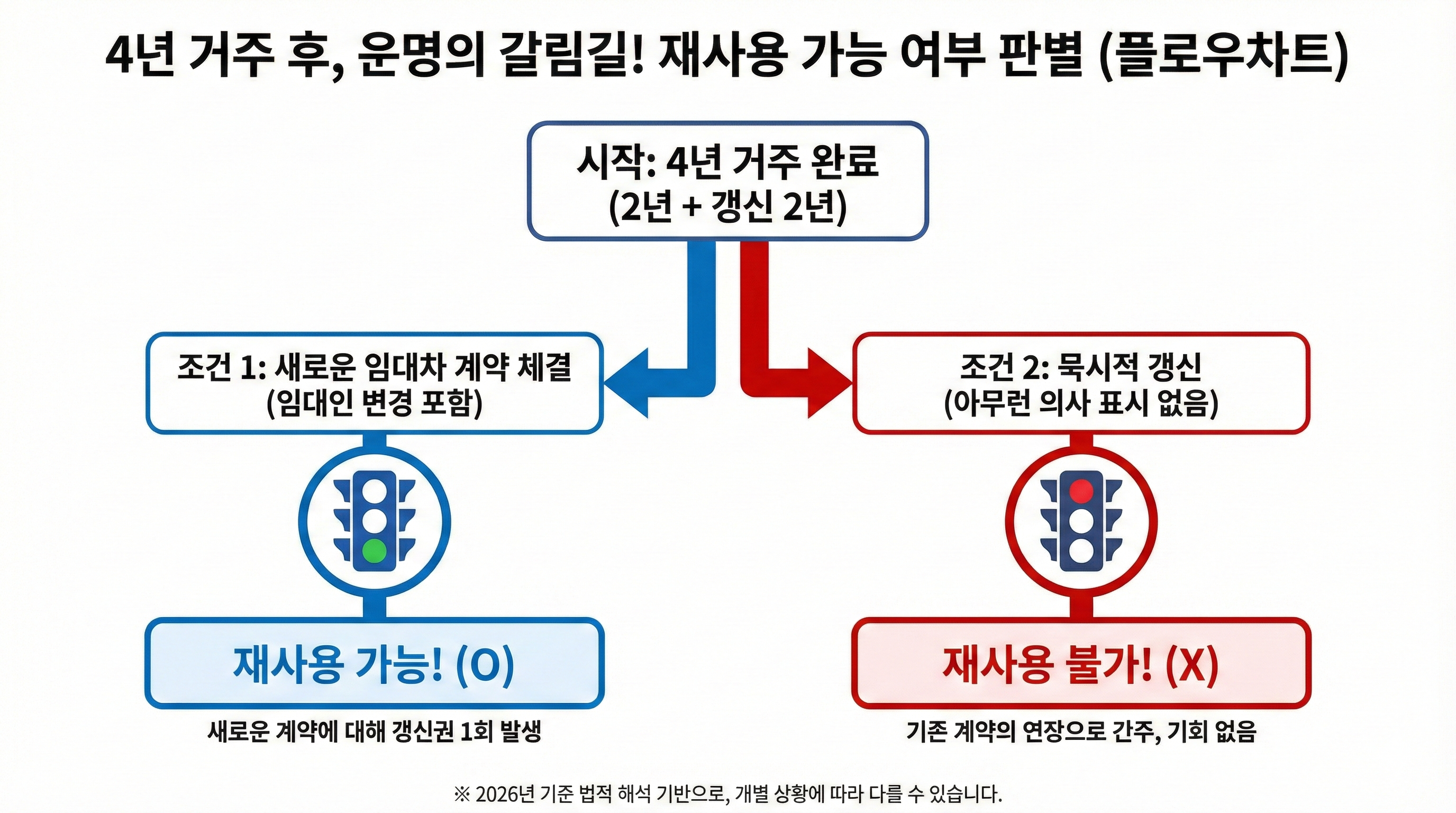 이렇게 되면 총 4년(최초 2년 + 갱신 2년) 동안 한 번의 '임대차 계약'이 이어지는 것이죠. 주택임대차보호법은 이 하나의 임대차 계약 주기 안에서 갱신청구권을 한 번만 사용할 수 있도록 규정하고 있는 거예요.