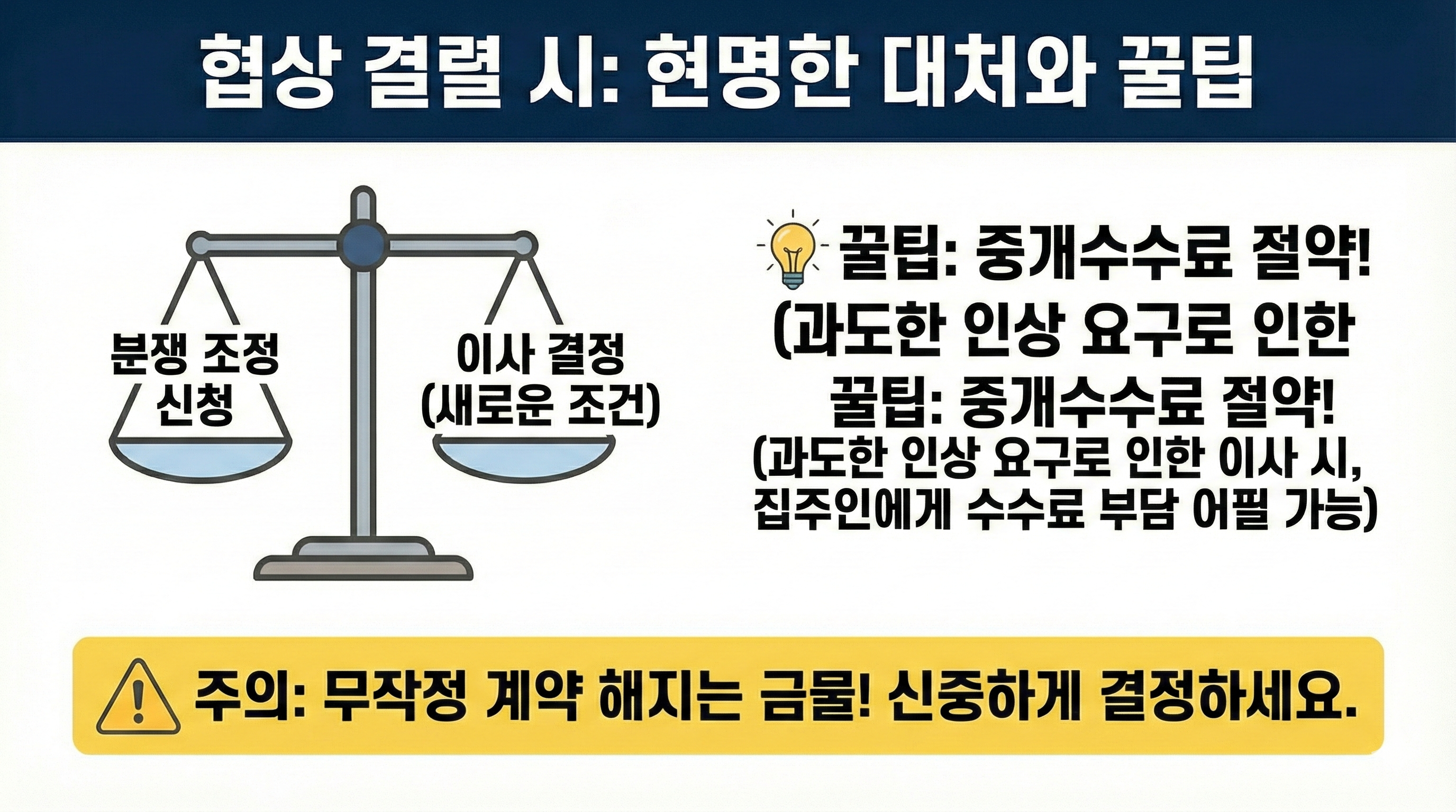 - 협상 결렬 시 임대차 분쟁 조정이나 이사 등의 선택지를 고려하고, 중개수수료 문제도 꼼꼼히 따져보세요.