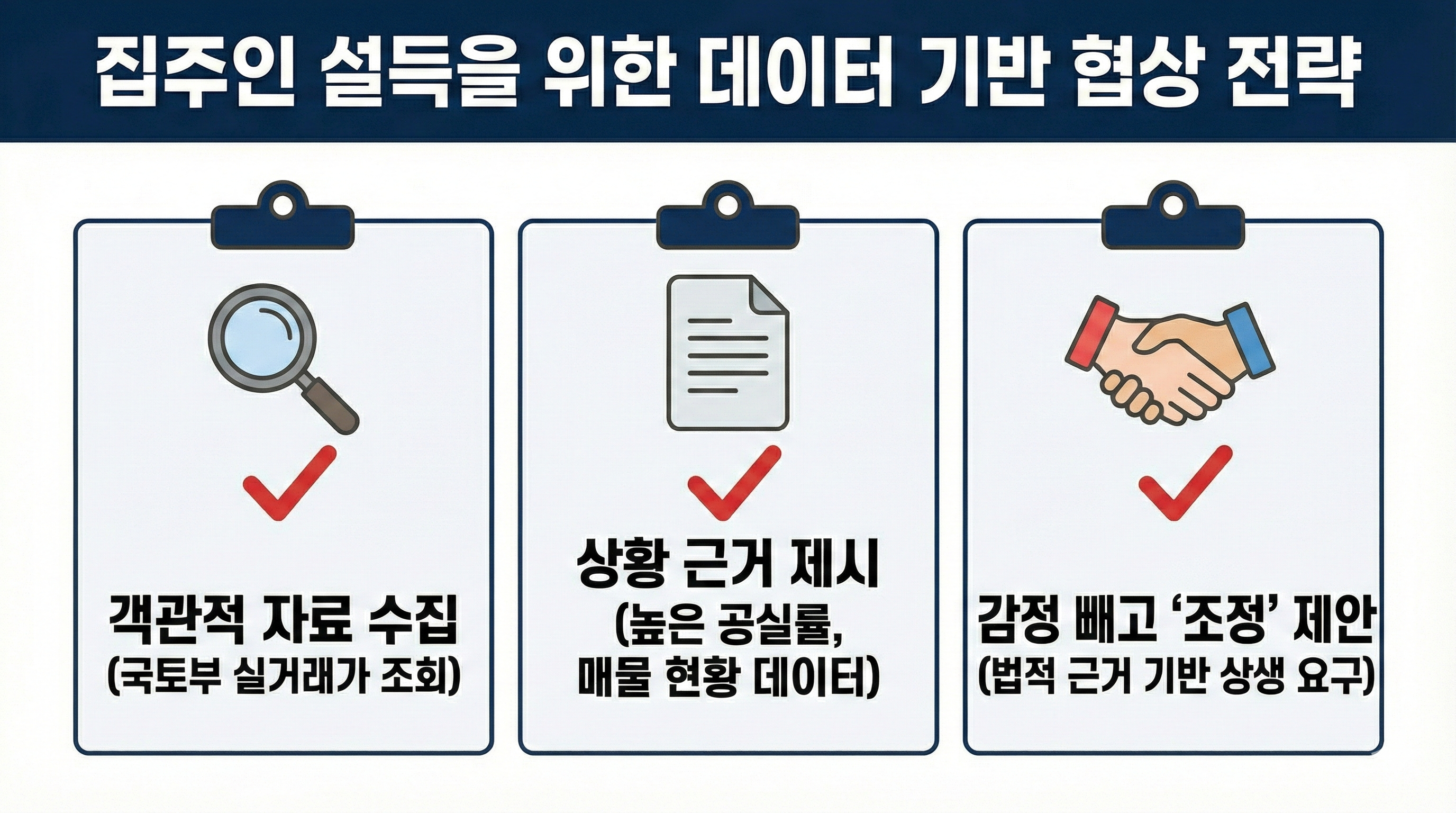 - 주변 시세 철저히 조사하고, 법적 근거를 바탕으로 집주인과 합리적으로 협상하세요.