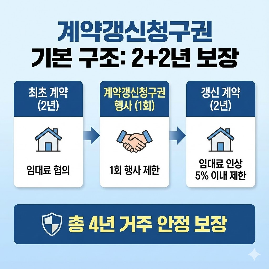 즉, 최초 2년 계약에 갱신청구권을 한 번 행사하면 총 4년간 거주가 보장되는 구조이죠. 이것이 바로 우리가 흔히 말하는 '2+2년 제도'의 핵심입니다.