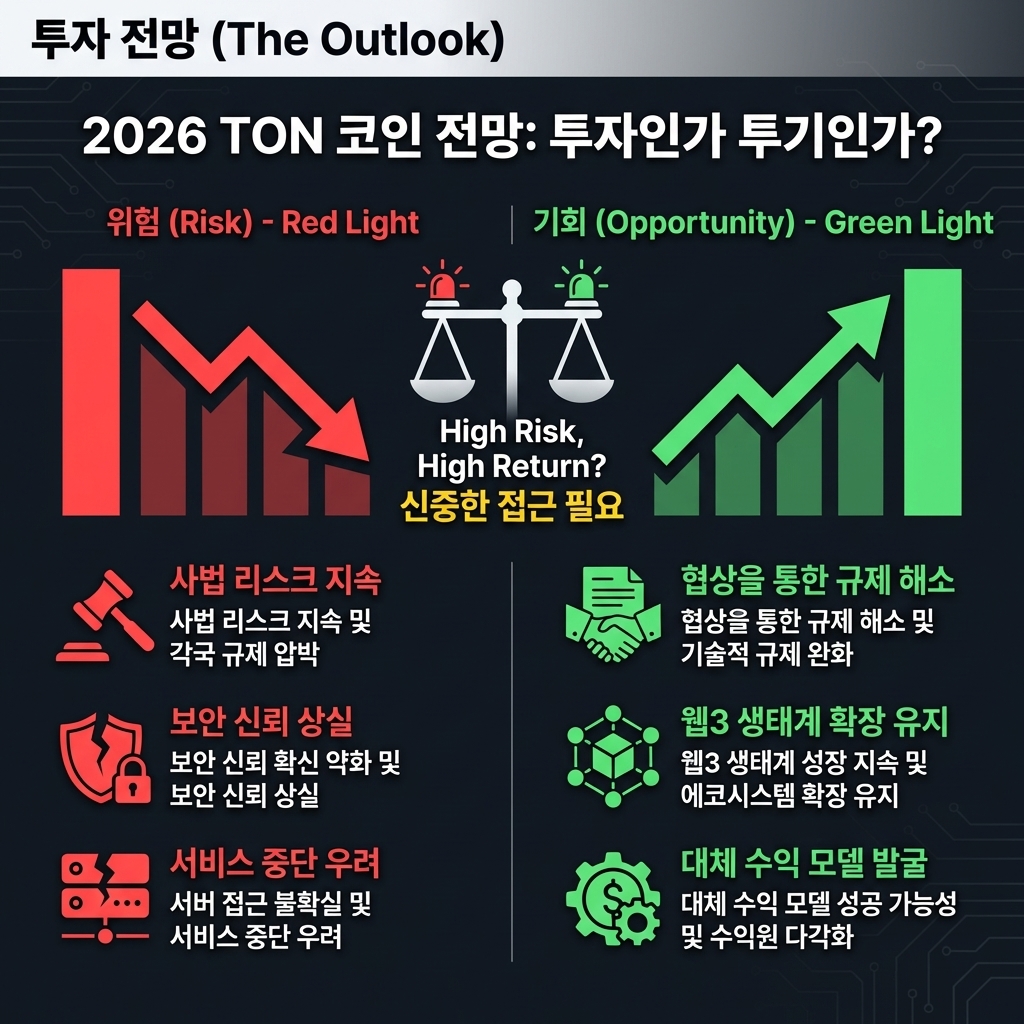 텔레그램은 자체 블록체인 프로젝트인 TON(The Open Network)과 TON 코인을 통해 새로운 비즈니스 모델을 모색하고 있습니다. 하지만 2026년 현재, TON 코인 전망은 여전히 불확실한 요소가 많습니다. 규제 당국의 감시 강화와 암호화폐 시장의 변동성은 TON 생태계의 성장에 계속해서 걸림돌이 되고 있습니다.