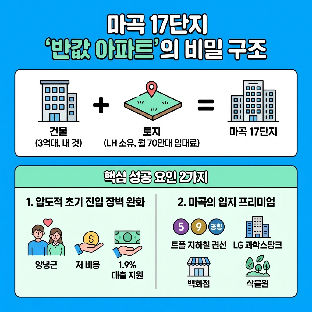 마곡 17단지 토지임대부 분양주택은 이름 그대로 '토지는 공공이 소유하고, 건물만 개인이 분양받는' 방식이에요. 예를 들어, 2026년 기준으로 인근 시세가 10억 원을 훌쩍 넘는 곳임에도 불구하고, 분양가는 약 3억 원대로 책정되어 '반값 아파트'라는 별명이 붙었죠.