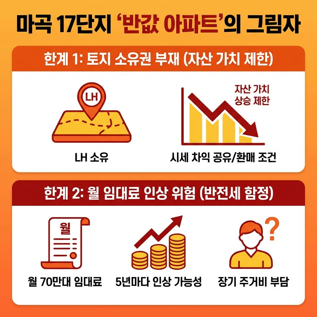 자, 이제 빛 뒤에 가려진 그림자를 볼 차례입니다. 마곡 17단지의 가장 본질적인 한계는 바로 토지 소유권이 없다는 점이에요. 우리는 건물만 분양받는 것이고, 토지는 LH(한국토지주택공사) 소유로 남습니다.