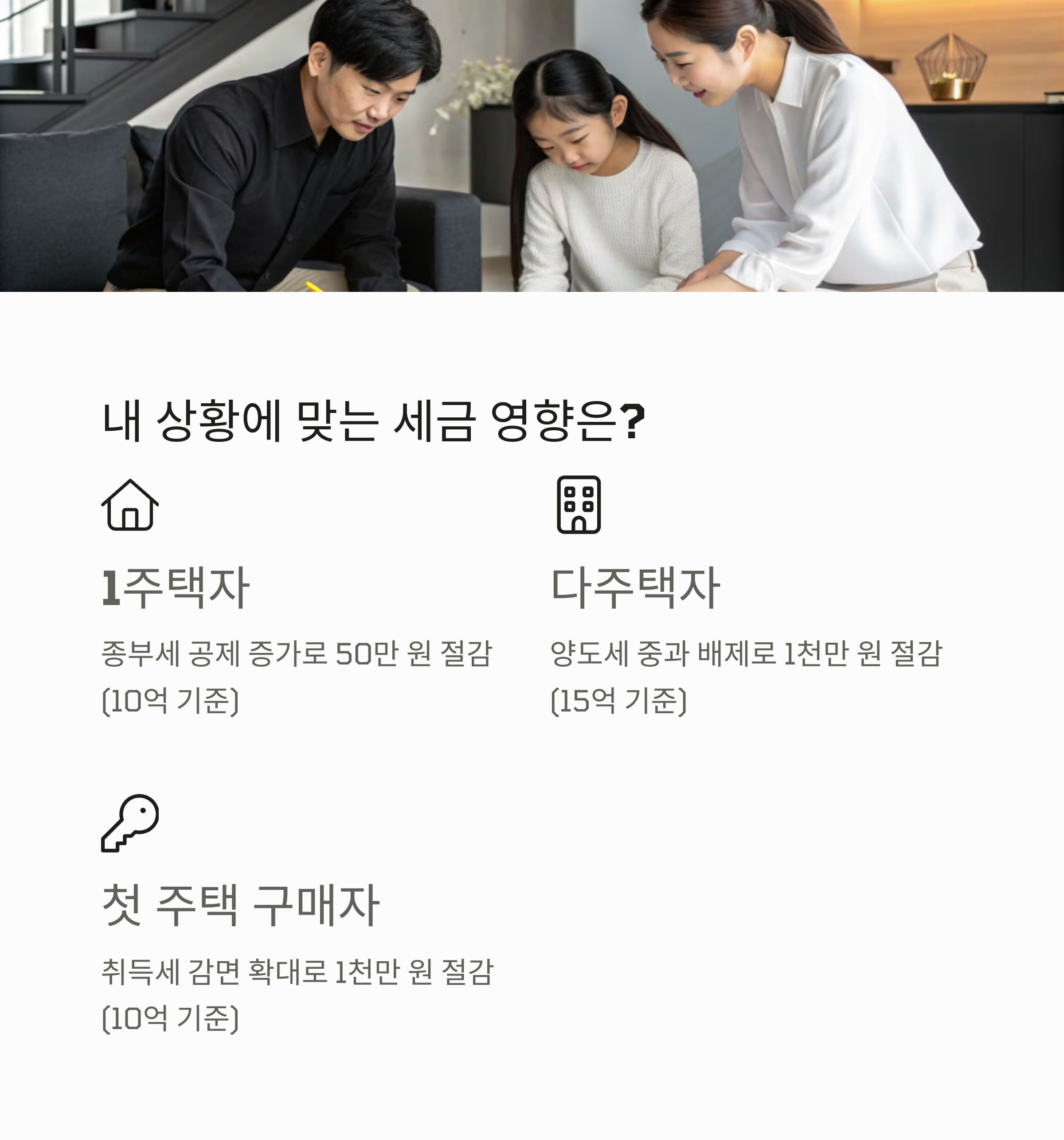 | 1주택 (10억) | 종부세 공제 증가 | 50만 원 |