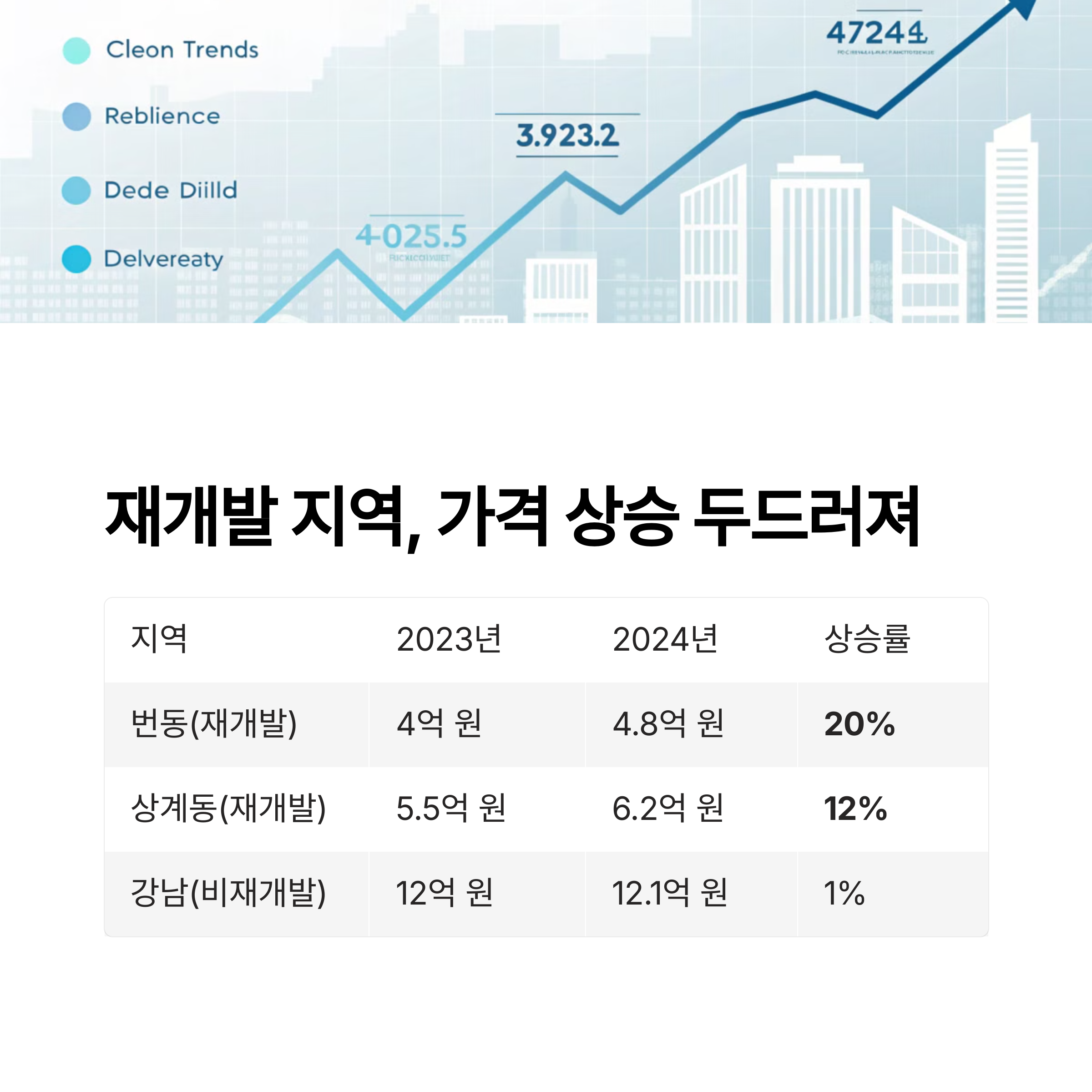 | 강남(비재개발) | 12억 원 | 12.1억 원 | 1% |