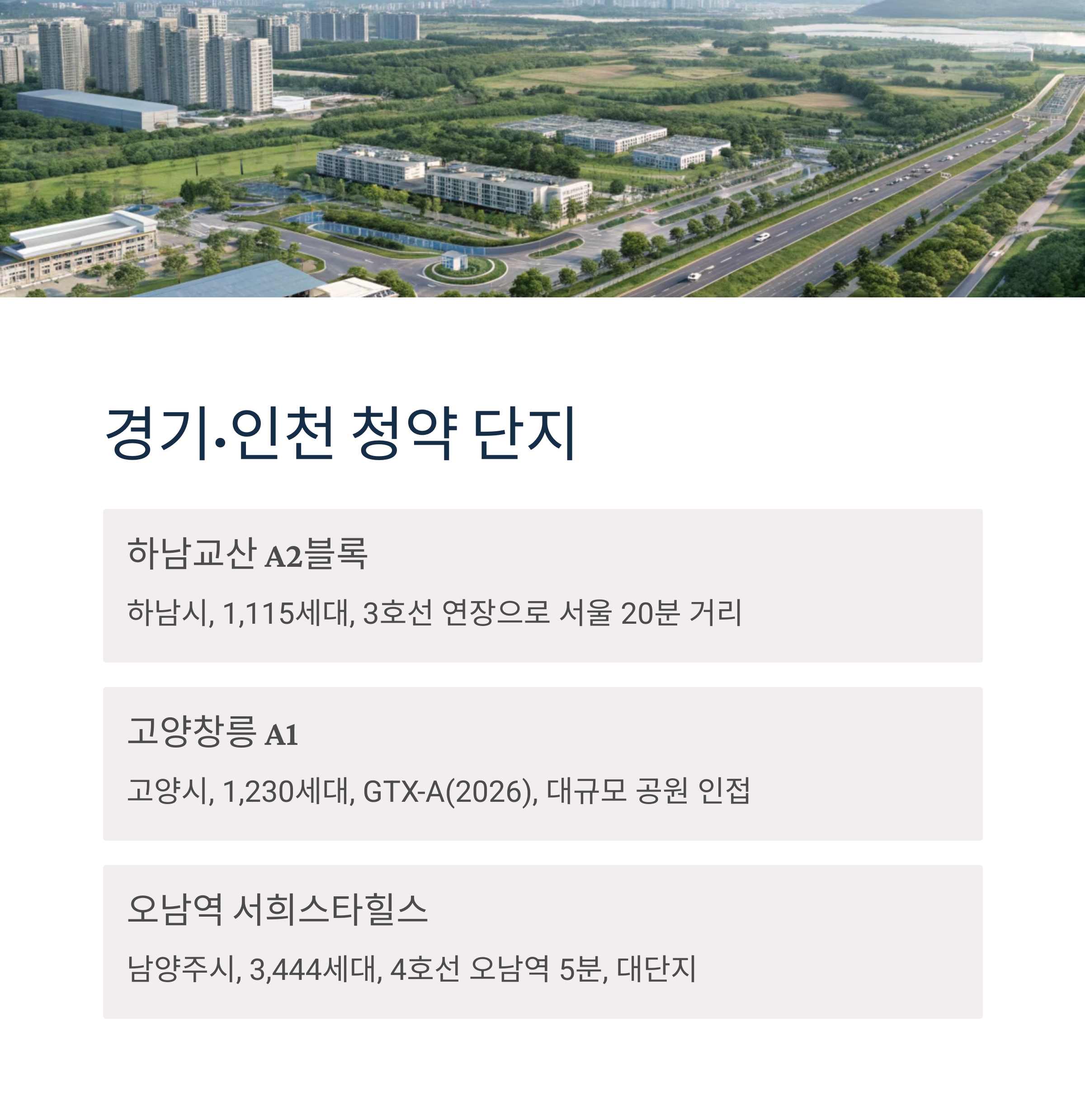 하남시 | 1,115 | 2025년 3월 예정 | 지하철 3호선 연장 예정, 서울 20분 |