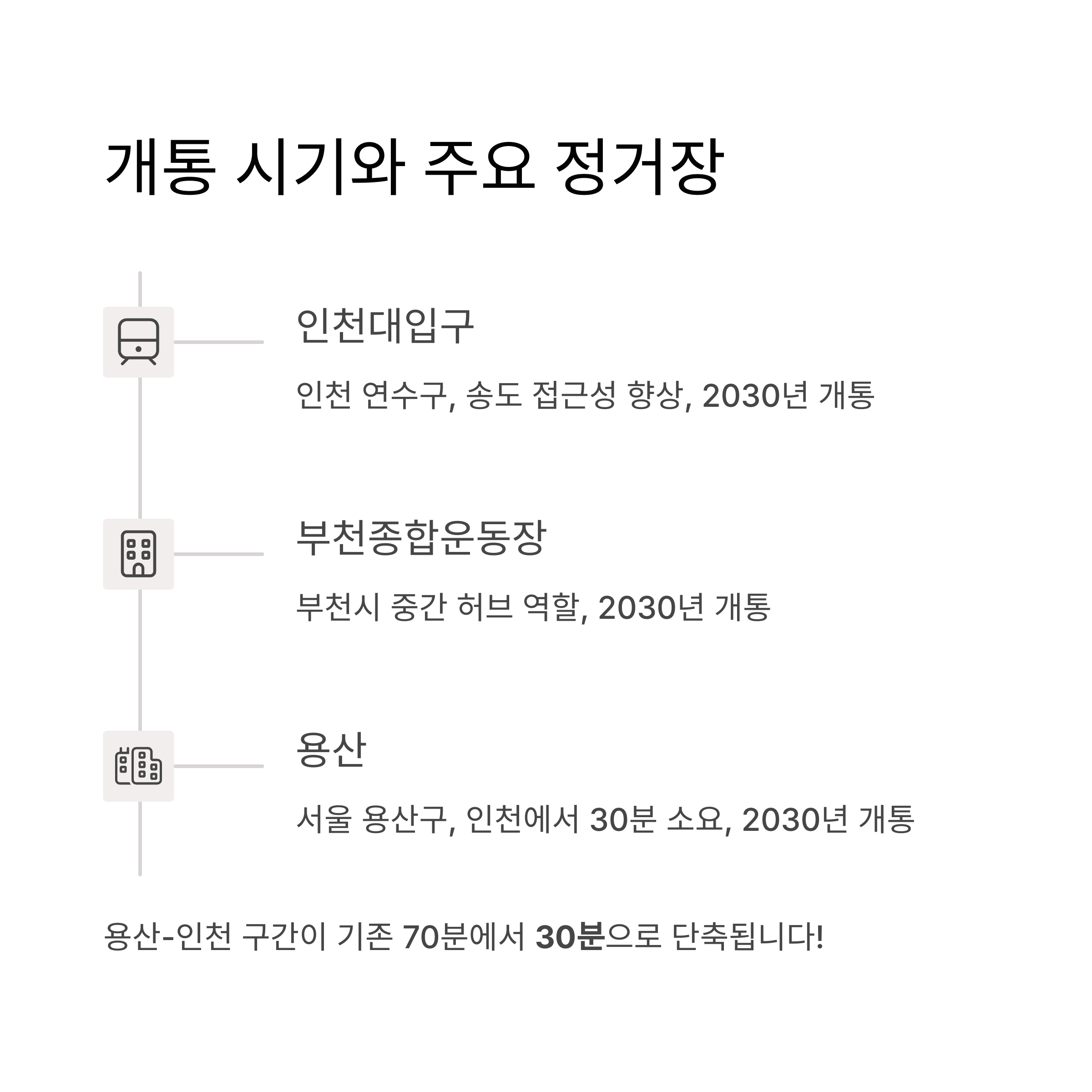 | 민자 구간 | 인천대입구-용산 | 인천대입구, 석남, 부평, 부천종합운동장, 신도림, 여의도, 용산 | 47.5km | 3조 5,000억 원 | 2025.05 예정 |